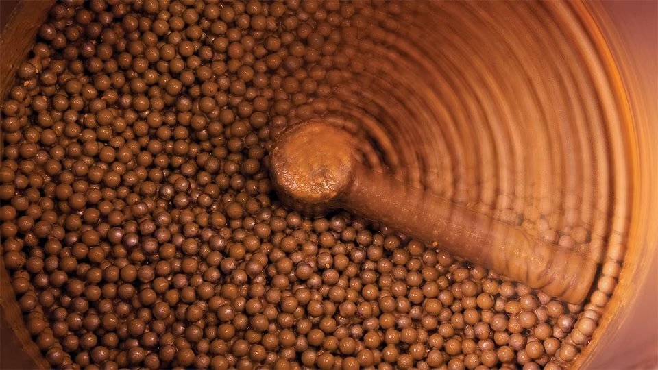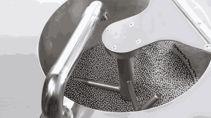 The refining cylinder is also regulated to maintain a warm temperature to prevent the fatty residues between the balls from solidifying during pauses in the working cycle.
