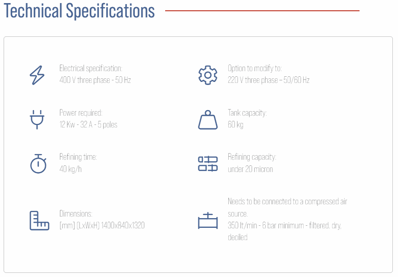 The Micron 50 ball refiner was designed for the production ofspreadable creams , anhydrous pastes for ice creams , pralinated products and cream sweets . The machine is equipped with arefrigerator with the purpose of regulating, within the set limits, the excess heat caused by the friction generated between the spheres. Thus doing we preserve unaltered the organoleptic qualities of the product.