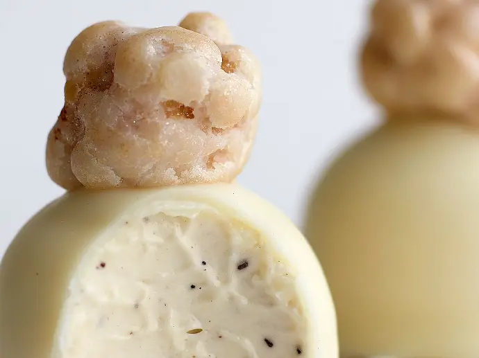 A balanced 30% cocoa white chocolate with tones of vanilla and cooked milk.
