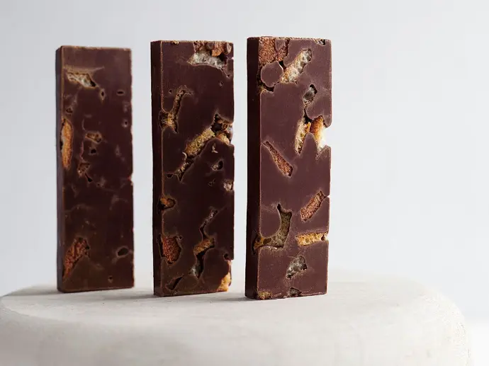 A dark chocolate with a roasted cocoa taste and fruity notes.